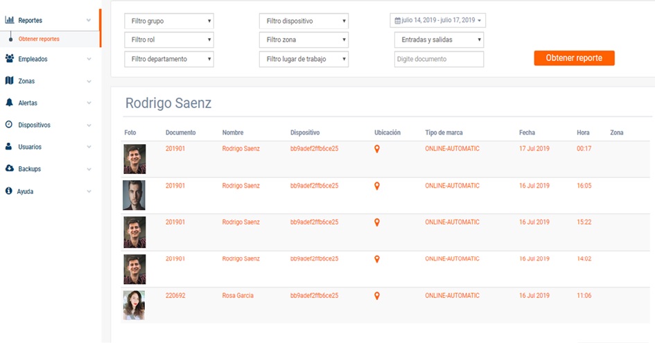 - 3. Los reportes se pueden filtrar por: Grupo, Rol, Departamento, Dispositivo, Zona o Lugar de trabajo.